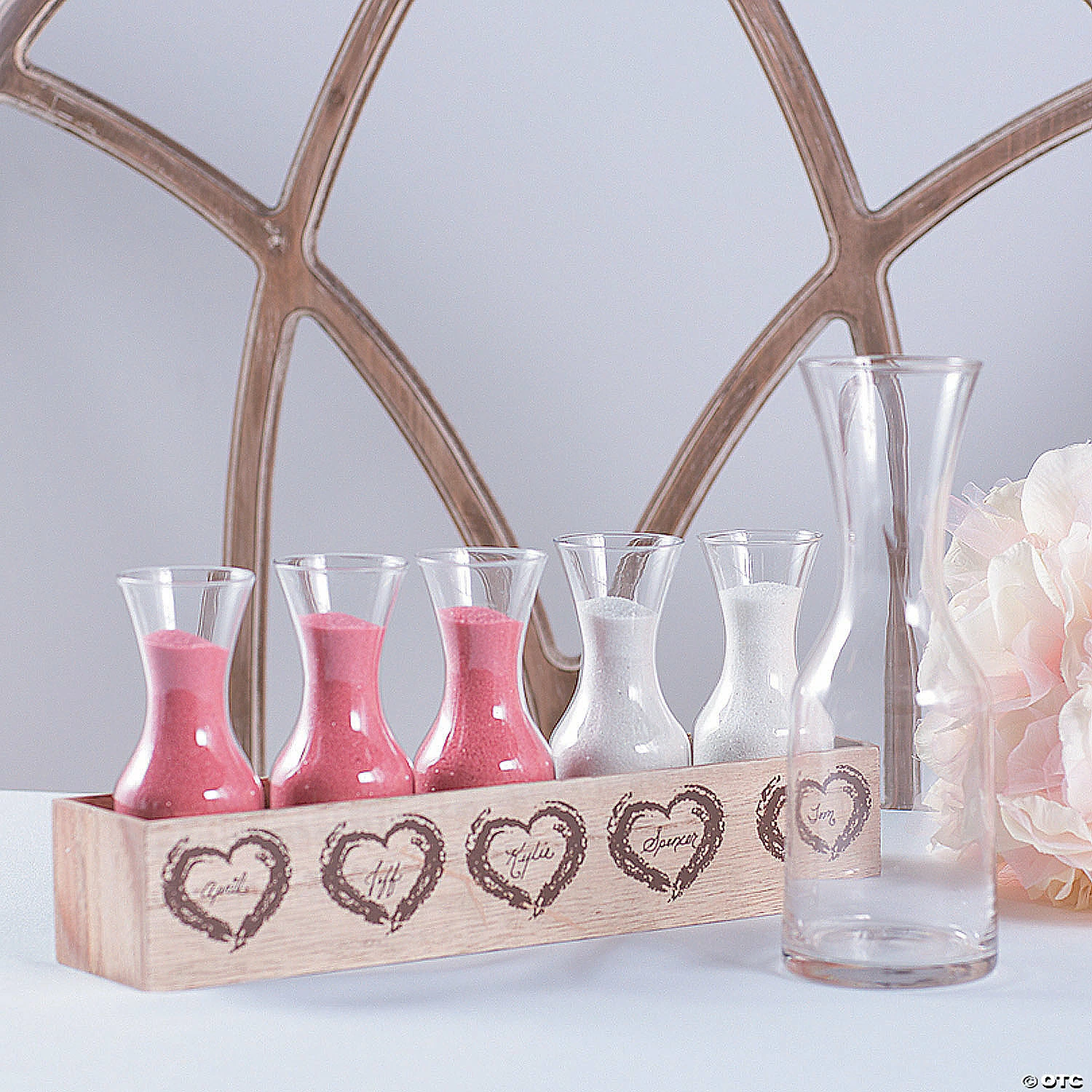 A unity ceremony is an important part of your day, and this set is perfect for your beach wedding! A sand ceremony is the symbolic blending of different colored sands into a single vessel. Once combined, it’s very difficult to separate them back to their original states, much like a couple. This Blended Family Unity Sand Ceremony Set also includes extra vessels for children or other members of the family to blend together. Check out our selection of colored sand to coordinate with your wedding colors and wedding decorations. Use your own permanent marker to add names to each heart. Includes five 6″ x 2 1/2″ diam. glass cylinders in a 13 3/4″ x 2 1/2″ x 2 1/2″ wooden holder and one 9 1/2″ x 3″ diam. vase. (7 pcs. per set) Large cylinder holds 1 lbs. of sand when full. ยฉ OTC