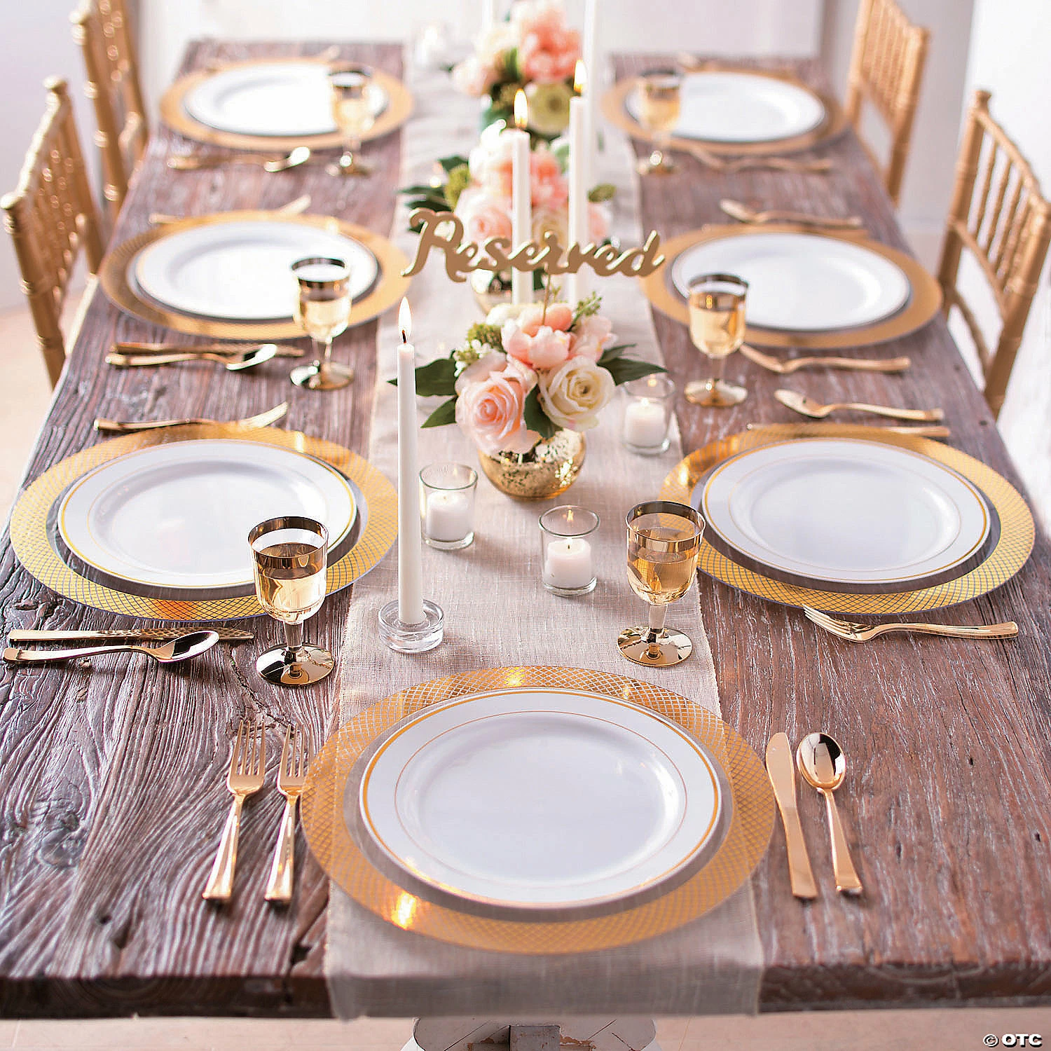 Reserve your wedding reception tables in style with these Gold Calligraphy Reserved Table Signs. Put them in your centerpieces for eye-catching displays! Great for other events, too – just place these signs wherever you need to reserve tables. Wood. (6 pcs. per unit) Base, 5″ diam.; dowel, 9-1/2″; sign, 9″ x 2-1/2″. ยฉ OTC