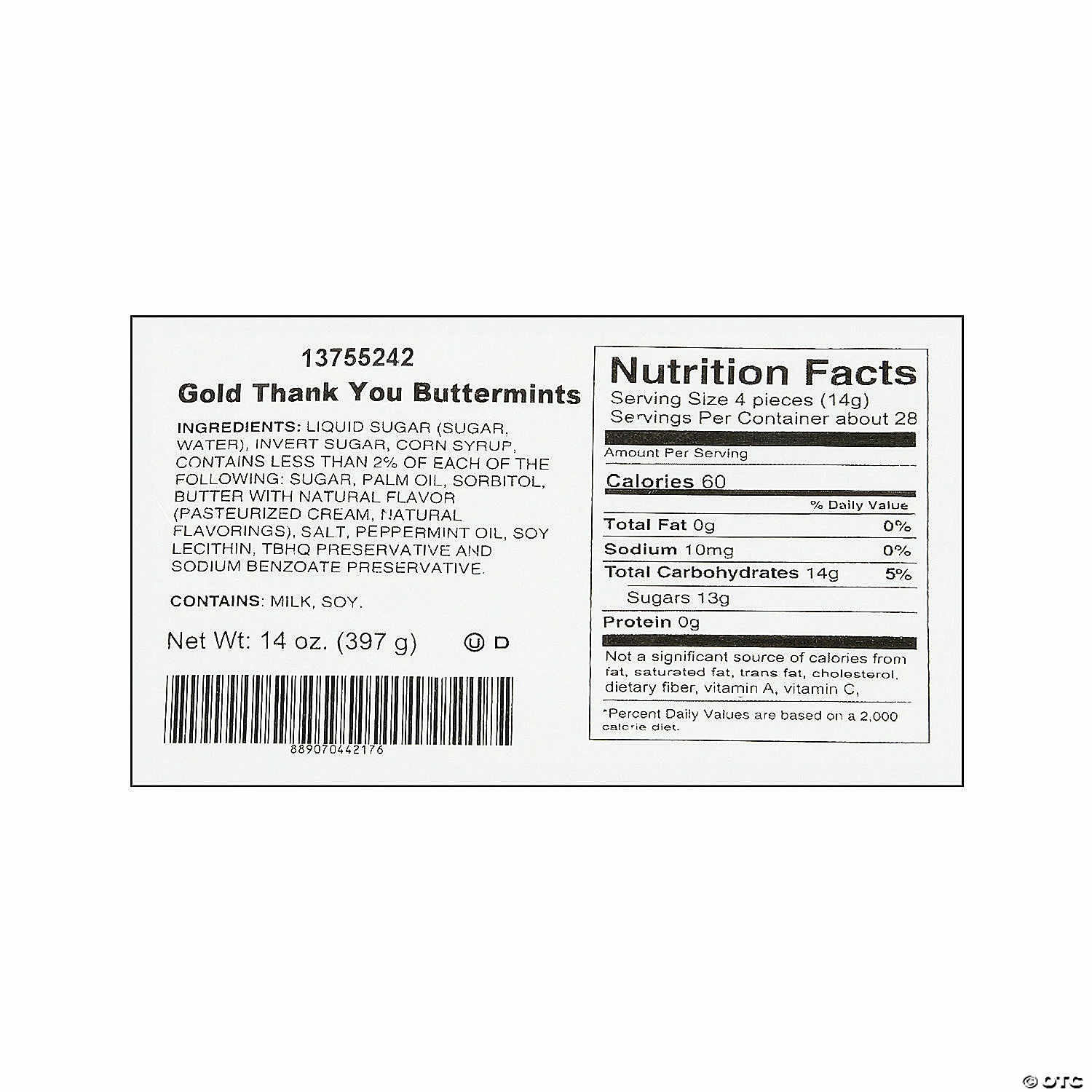 โข What’s Included: This set includes 108 individually wrapped mint sets printed in gold to read: Thank you! They’re perfect for wedding receptions, commitment ceremony celebrations, graduation parties and bridal showers. โข Non-Returnable: Candy is non-returnable. For more information, visit the Return Policy page located on our website.โข Important Country of Origin Information: Made in the U.S.A. For certain items sold by OTC on our Web or Mobile sites, country of origin information can change and what is displayed may not be accurate or consistent with manufacturer information. For up to date country of origin information, it is recommended that you rely on product packaging or other manufacturer information.โข Product Information: These buttermints are fat-free, gluten-free, nut-free and Kosher (dairy). Details about ingredients, nutrition, allergens and other product information are provided on our Web and Mobile sites for reference purpose only, without warranty or representation as to accuracy. Manufacturers adjust their labeling regularly and are solely responsible for the accuracy of the information. For general questions concerning these items, please contact our customer service at 800-228-0475.Product Description: Thanks a mint! With beautiful gold script and tasty mints inside, these gold thank you buttermints are a sweet way to show your gratitude. The set includes 108 packages, giving you enough for wedding receptions, bridal showers or graduation parties. Scatter the buttermint packages onto tables as tasty decor or fill decorative dishes with them and place on the dessert table. Each package includes two buttermints and features gold script that reads: thank you. Specs:Size: 14 oz. totalQuantity: 108 piecesDietary needs: Fat-free, Nut-free, Gluten-free and Kosher (dairy)Brand: ยฉ OTC – Oriental Trading Company