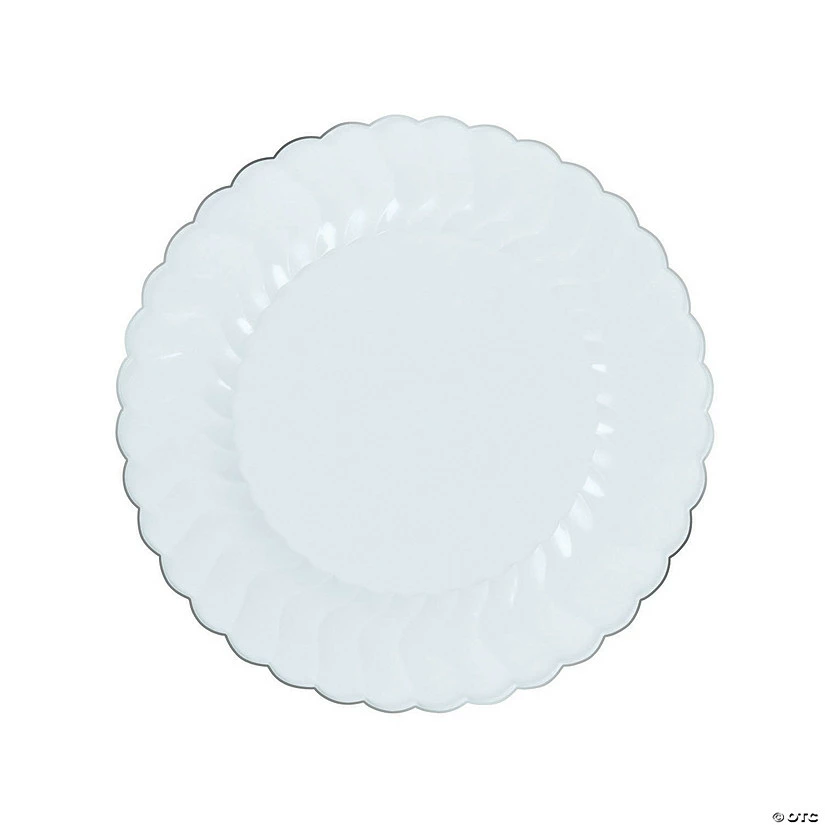 Serve your wedding cake in classic style with these White Premium Plastic Dessert Plates Silver Edge. These plastic plates with scalloped edges have the look of elegant china with the convenience and low cost of disposable plates. A great addition to wedding reception supplies. Plastic. (25 pcs. per unit) 7 1/2″ diam.