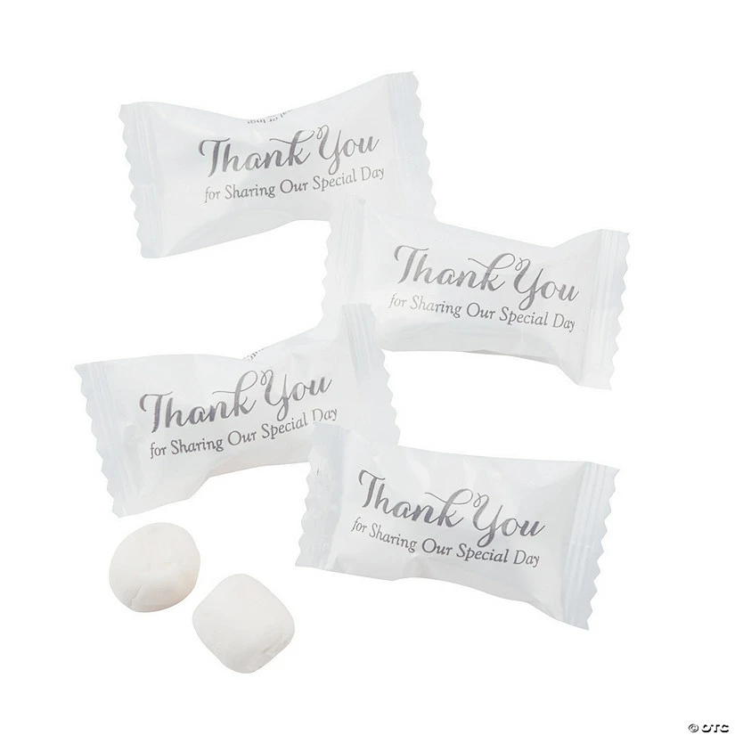 These white-wrapped mints add a sweet personal touch to your wedding candy buffet. Each wrapper reads “Thank you for sharing our special day” – these classic goodies are a deliciously beautiful way to make your treat table into a stunning display. Individually wrapped. (Approx. 108 pcs. per unit) Total wt., 14 oz. Β© OTCβ’ Fat-free.β’ Gluten-free.β’ Kosher.β’ Nut-free.β’ Candy is non-returnable. For more information, visit our βReturn Policyβ page located on our website.β’ Made in the USA, Important Country of Origin Information: For certain items sold by OTC on our Web or Mobile sites, country of origin information can change and what is displayed may not be accurate or consistent with manufacturer information. For up to date country of origin information, it is recommended that you rely on product packaging or other manufacturer information. β’ Ingredient, nutrition, allergen and other product information are provided on our Web and Mobile sites for reference purpose only, without warranty or representation as to accuracy. Manufacturers adjust their labeling regularly and are solely responsible for the accuracy of the information. For general questions concerning these items, please contact our customer service at 800-228-0475.