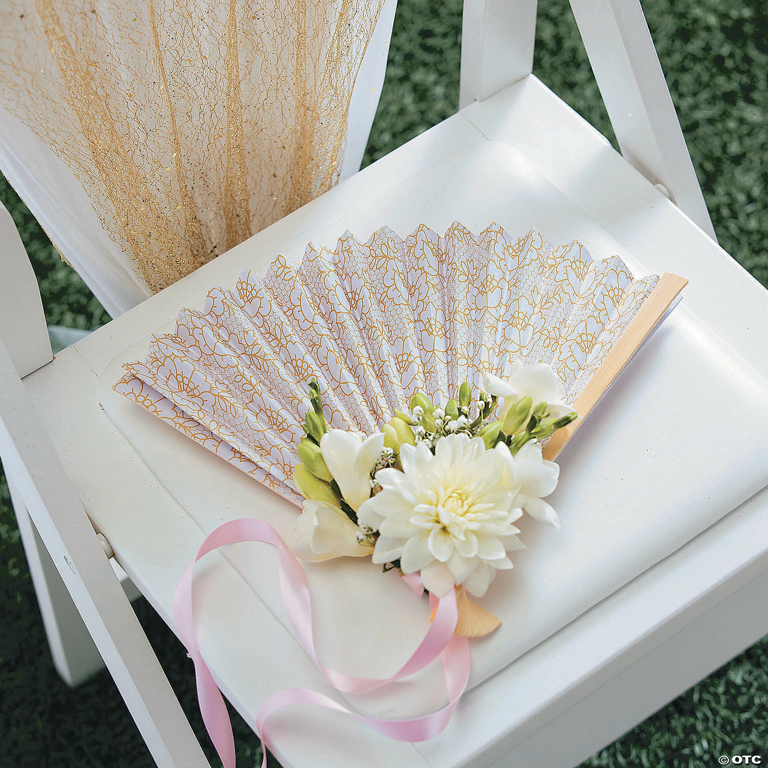 Perfect for outdoor weddings during the warm summer months, these Shabby Chic Lace Design Folding Hand Fans also make great wedding decorations for that special day. Place them on reception tables or place them in gift bags for your wedding guests. Expands up to 17″. Wooden handle with lace design paper fan. 10″ ยฉ OTC